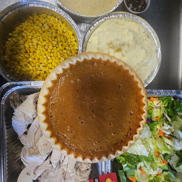 Family Turkey Meals feed 6. Include salad, turkey, stuffing, gravy, vegetable, potato, cranberry sauce and pumpkin pie